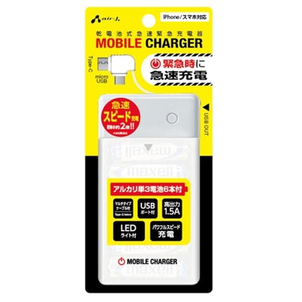 - 関連キーワード: 乾電池式 充電器 乾電池 USB ポート タイプC 1.5A iPhone android アイフォン アンドロイド 乾電池式充電器 電池 Type-C typeC スマホ 充電器 LEDライト 単三 アルカリ 単3 持ち運び 持ち歩き 外出時 災害 避難 防災 災害グッズ 災害用品 防災用品 防災グッズ 避難用品 避難グッズケーブル(microUSB+Type-C)+USBポート付 乾電池式緊急充電器 【特徴】 ●コンセント不要、乾電池からいつでも充電できる、収納式マルチコネクターケーブルを搭載した乾電池式充電器です。 ●乾電池タイプとして高出力な1.5A(アンペア)で、弊社1Aタイプに比べ2倍の急速スピード充電を実現。(1時間30分の充電で約70%充電。※iPhone8使用時 ※当社製品比) ●収納式マルチコネクターケーブル(microUSB+Type-C)搭載により、これ1台で様々なスマートフォン充電に対応。 ●USBポートから、お手持ち又は別売のLightningケーブルを使用して、iPhoneへの充電にも対応。 ●停電などの緊急時に大変便利なLEDライト搭載。 【主な仕様】 ●アルカリ単3電池6本付 ●マルチタイプケーブル付(Type-C/microUSB) ●USBポート付 ●高出力1.5A ●LEDライト付 ●パワフルスピード充電 出力:Type-C/microUSB - 5.0V / 1.5A (最大) 出力:USB-A - 5.0V/1.5A (最大) ※乾電池は1回で使い切る事を推奨いたします。容量の低下した乾電池を使用しますと、再度充電を開始した時に正常に充電ができなくなる場合があります。 ※iPhoneを充電する際は、お手持ちまたは別売りの、Lightning-USBケーブルをご使用ください。 ※ご使用に際しまして、通話内容・各種メモリー内容に関する損害等の保証は一切できません。ご承諾の上、控えを取ってからご使用下さい。 ※記載の商標及び商品名は各社の商標及び登録商標です。 ※製品の仕様・外観・パッケージデザイン等は、改良のため予告無く変更する場合があります。 ※本製品での2台同時充電はできません。 乾電池別売タイプはこちら ⇒ BJ-USB6A WH(BJ-USB6AWH):4526397988166 BJ-USB6A BK(BJ-USB6ABK):4526397988159 こちらもおすすめ! →本体+乾電池6本付き →本体のみ※乾電池の付属なし ▼当店人気商品▼今いちばん売れてます!