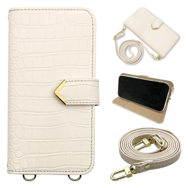 Galaxy A41 SC-41A SCV48 ギャラクシーA41 対応 スマホショルダー 手帳型 ケース (オフホワイト) myones 斜めがけ ストラップ 付き クロコ柄 型押し ワニ革調 スタンド機能 落下防止 カード収納 ニュアンスカラー くすみカラー PUレザー