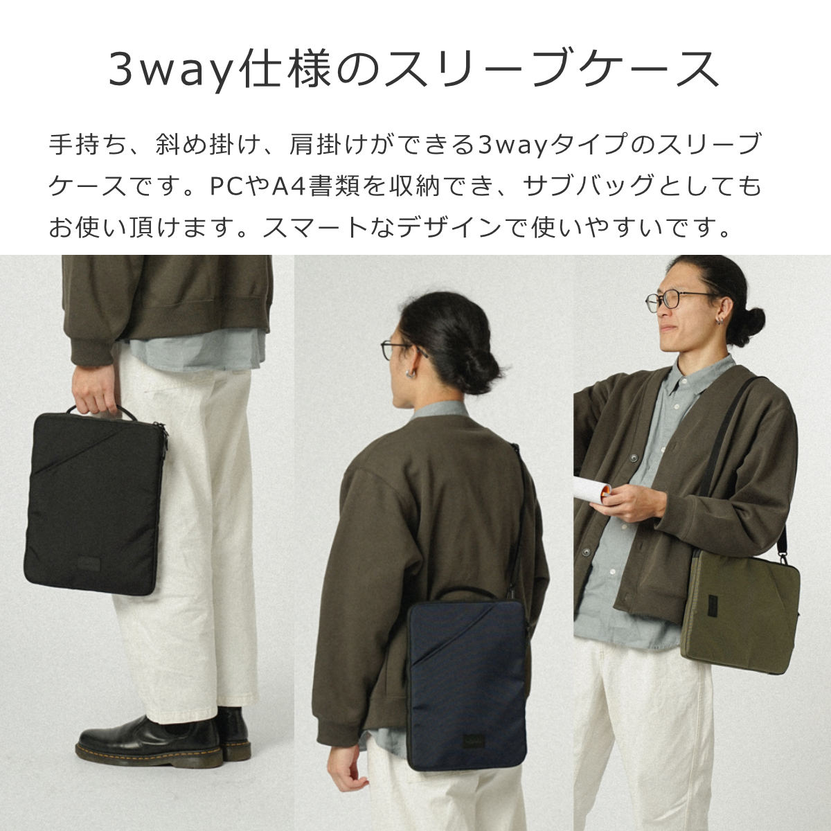 ●手持ち、斜め掛け、肩掛けができる3wayタイプのスリーブケースです。