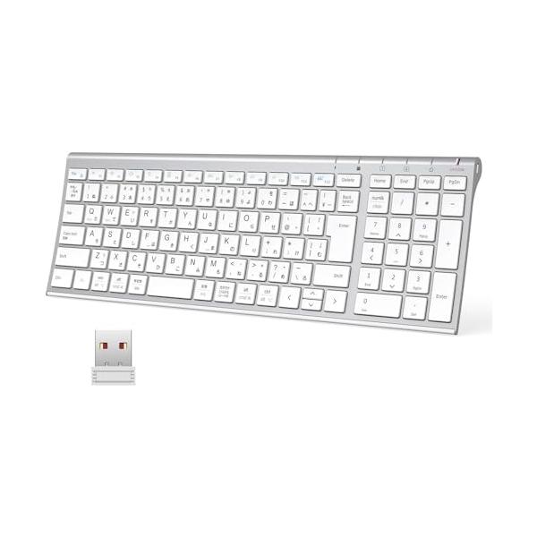 - 【2.4GワイヤレスJIS配列キーボード】2.4GHzワイヤレステクノロジーにより、近周波数の電波が多く存在する環境でも、遅延やデータ欠落、干渉のない、安定した通信で快適に操作出来ます。更に最大10mの動作距離を実現しました。レシーバー式で、USBポートにレシーバーを差すだけで簡単に使えます。【タイピングしやすい】ノートPCと同じ「パンタグラフ方式」を採用しており、打ちやすい19mmキーピッチ、ネイルアートを施した指先でも操作しやすくなっています。浅めな1.8mmキーストロークは、静か、快適、滑らかなタイピング感を実現。また、人間工学に基づいたやや傾ける斜面設計で手の疲労を削減します。特にノートパソコンをよく使う方、高速入力を求める方におススメです。【テンキーやFキーある&作業効率アップ】テンキーを搭載しているため、数字入力を行う表計算や会計業務にも便利です。さらに、マルチファンクションキーを搭載し、ページのスクリーンショットやカタカナ変換などの作業を相応なキーで行えて、効率よく作業できます。【長時間使用可能と優れた耐久性】USB充電式キーボードです。一回フル充電後、90時間連続使用可能です。キーボードの裏面に亜鉛メッキ鋼板が使用され、プラスチック製品よりも一段と高級感、品質感があります。素材の性質は、腐食されにくく、長年の使用に耐えられ、耐久性に優れています。【幅広い互換性と薄型デザイン】Windows XP、Vista、Win 7、Win 8、Win 10及びMacと互換性があります。 (注:Mac miniに対応しません)PC、デスクトップ、およびラップトップで操作できます。3.95mm極薄の洗練されたボディ、シンプルでお洒落な外観、オフィスでも家でも使えます。本体寸法:36.6x12.5cm、キーボードの薄さ(奥1.6〜手前0.3cm)が作業をスピードアップさせます。123