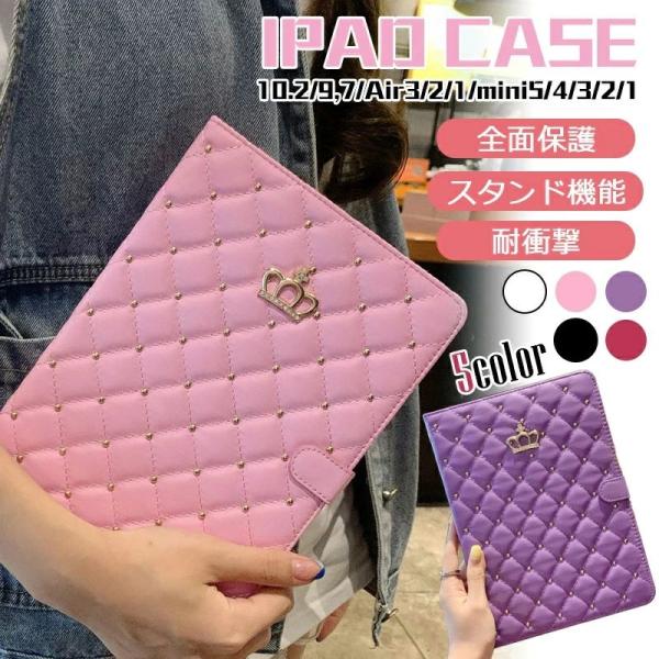 【強化ガラスフィルム 付き】ipad ケース 第9世代 2021 第8世代 2020 第7世代 カバー クラウン 王冠 上品 手帳型 チェック レザー 衝撃緩和 オートスリープ iPad