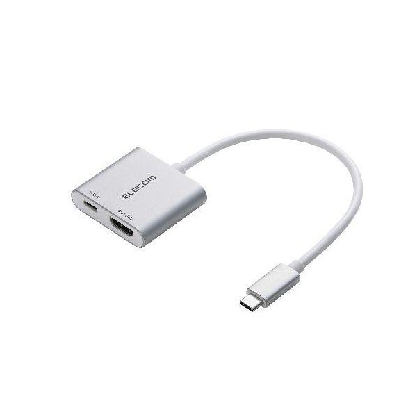 - エレコム MPA-CHDMI100SV USB Type-C HDMI 変換アダプタ PD100W充電ポート搭載 iPhone等対応 シルバー 発売日:2025年7月12日●スマホを充電しながら使える!スマートフォンやパソコンなどの映像をディスプレイなどに出力できる、USB Type-C(TM)ポートをHDMI(R)ポートに変換するアダプターです。HDMIコネクター搭載ディスプレイなどに接続するだけで簡単に大画面に出力でき、画面複製と画面拡張に対応しています。本製品のUSB Type-Cポート(充電専用)に、USB Power Delivery対応AC充電器などを接続することで、映像出力と同時にスマートフォンなどの端末の充電もできます。●HDMI(R)コネクター搭載のディスプレイなどに映像を出力できる変換アダプターです。ディスプレイなどに接続するだけで、USB Type-C(TM)ポート搭載スマートフォンなどの映像を簡単に大画面へ出力できます。●※HDMIポートからUSB Type-Cプラグへの変換はできません。●※音声出力に対応しています。●※映像が正しく表示されない場合は、接続先のディスプレイなどの電源ON/OFFや各接続コネクターの抜き挿しをお試しください。●※環境、機器により正常に動作しない場合があります。●※すべての機器での動作を保証するものではありません。●※本製品で映像出力を行う際は、出力機器がDisplayPort(TM) Alt Mode対応であることをご確認ください。●※出力に必要な対応機器(HDMIケーブルなど)は同梱していません。別途ご購入またはご用意ください。●接続した複数台のディスプレイを1つの画面として表示する拡張モードと、出力側のディスプレイと同じ画面を表示する複製モードに対応しています。 【仕様】コネクター形状1:USB Type-C(TM)プラグコネクター形状2:HDMI(R)ポート(タイプA・19ピン)、USB Type-Cポート(充電専用)対応機器:USB Type-Cプラグ側:DisplayPort(TM) Alt Mode対応USB Type-Cポート搭載のスマートフォン・タブレットおよびパソコンなど対応機器:HDMIポート側:HDMIケーブル/ディスプレイ・プロジェクターなど対応機器:USB Type-Cポート側:USB Type-Cケーブル/AC充電器など対応解像度:最大4K(3840×2160px)/60HzUSB Power Delivery対応:○ 最大入力100W(20V/5A)、最大出力95Wケーブルタイプ:ノーマルタイプケーブル長:約0.15m ※コネクター含まずケーブル太さ:約4.3mm外形寸法:幅約46mm×厚み約11.5mm×高さ約41mm(アダプター部分)カラー:シルバーパッケージ形態:紙箱環境配慮事項:EU RoHS指令適合(10物質)、THINK ECOLOGYマーク