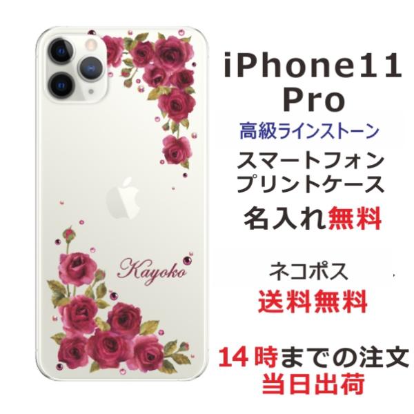 iPhone11 Pro ケース アイフォン11プロ カバー ラインストーン かわいい フラワー 花柄 らふら 名入れ 押し花風 ダークピンク ローズ