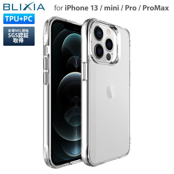 BLIXIAブランドから登場した iPhone 13 13mini 13Pro 13ProMax 用の 米軍MIL規格SGS認証取得 TPU+背面ポリカーポネート素材クリアケースです。