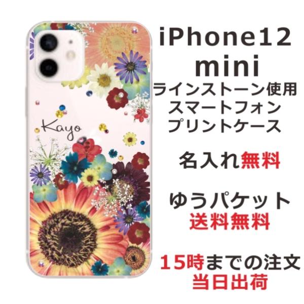 iPhone12 Mini ケース アイフォン12ミニ カバー ラインストーン かわいい フラワー 花柄 らふら 名入れ 押し花風 フラワーアレンジカラフル