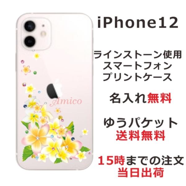 iPhone12 ケース アイフォン12 カバー ラインストーン かわいい フラワー 花柄 らふら 名入れ 押し花風 プルメリア