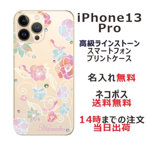 iPhone13 Pro アイフォン13プロ らふら 名入れ スマホケース ラインストーン スマホカバー 押し花風 フラワーバードナチュラル