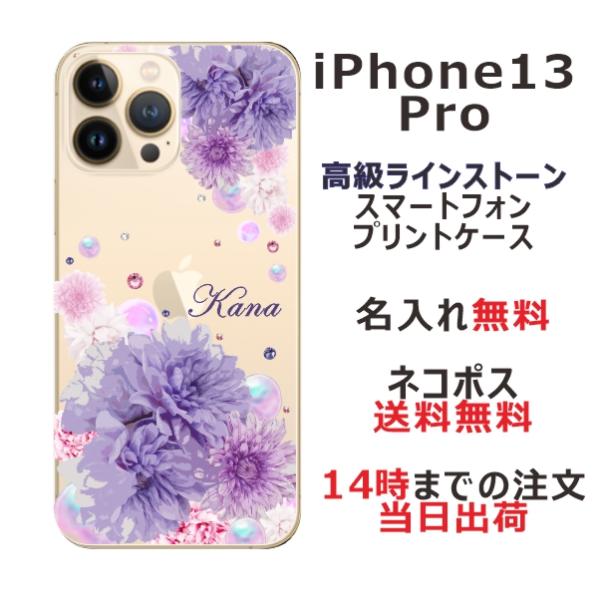 iPhone13 Pro アイフォン13プロ らふら 名入れ スマホケース ラインストーン スマホカバー 押し花風 フラワーバードパープル