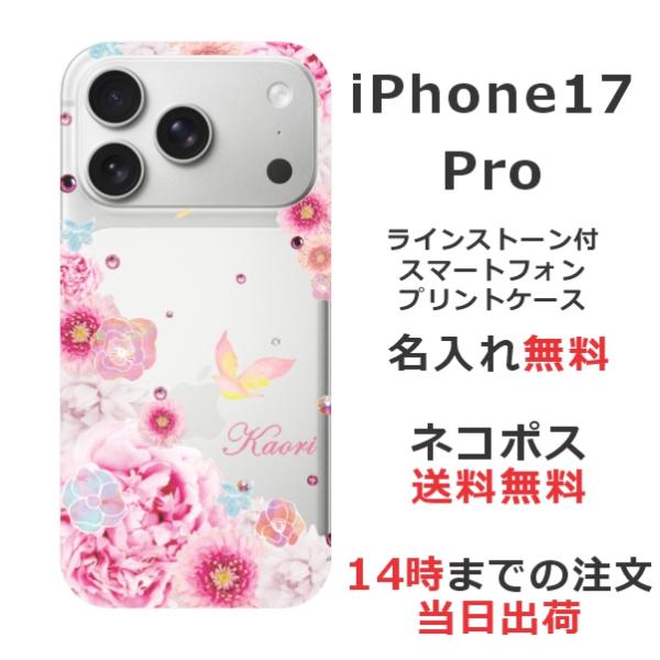 iPhone17 Pro アイフォン17プロ らふら 名入れ スマホケース ラインストーン スマホカバー 押し花風 フラワーバードピンク