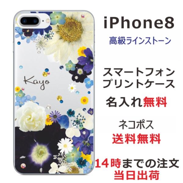 iPhone8 ケース アイフォン8 カバー ラインストーン かわいい らふら フラワー 花柄 押し花風 フラワーアレンジブルー