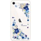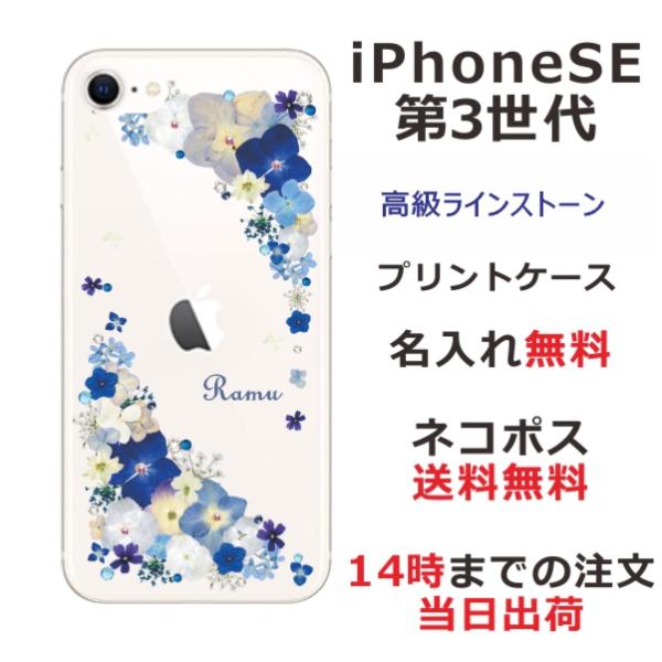 iPhone SE 第3世代 らふら 名入れ スマホケース ラインストーン スマホカバー 押し花風 ビビットブルーフラワー