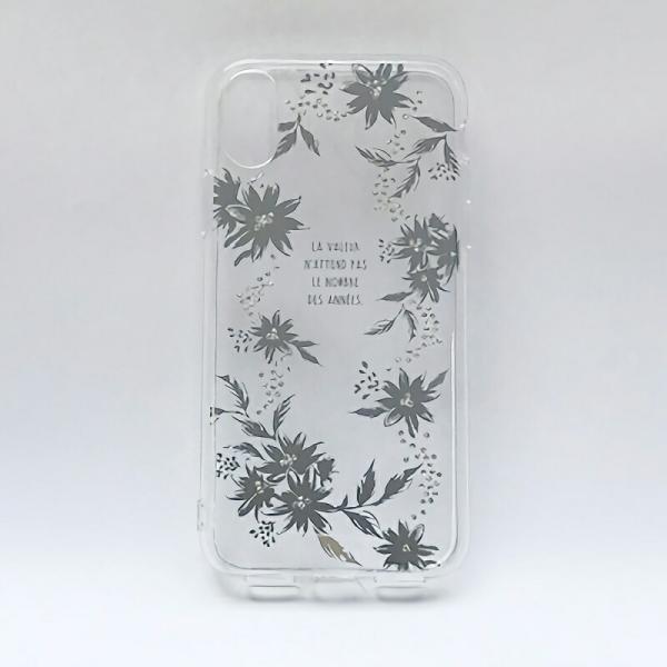 iPhone X XS クリア シルバー フラワー スマホケース Apple アップル 10 ハイブリッド ハードカバー クリスタル メタル デコレーション ストラップ スマホカバー