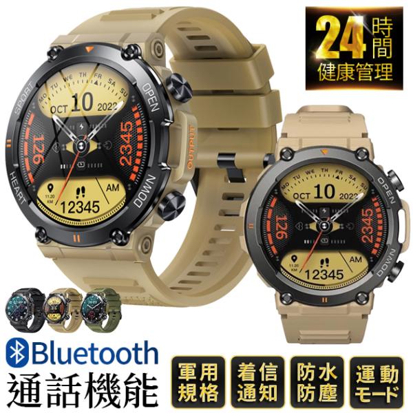 スマートウォッチ 軍用規格 丸型 軍用 スマート ウォッチ 体温測定 血圧 スポーツウォッチ 通話機能 メンズ iPhone対応 着信&line通知