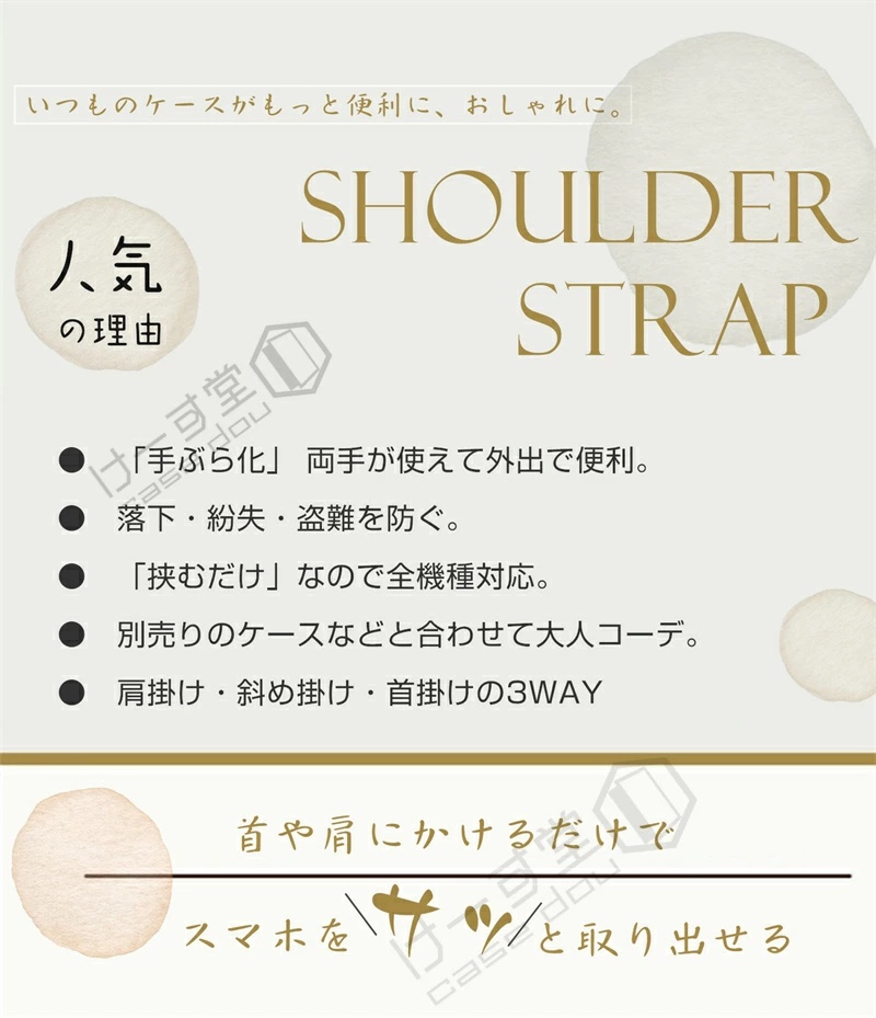 手掛けも首掛けも一本で! スマホショルダーストラップ 太め 付け替え 単品 携帯 ショルダーストラップ 大人 かわいい 幅広 手ぶら女子 軽量 落下防止 バッグ