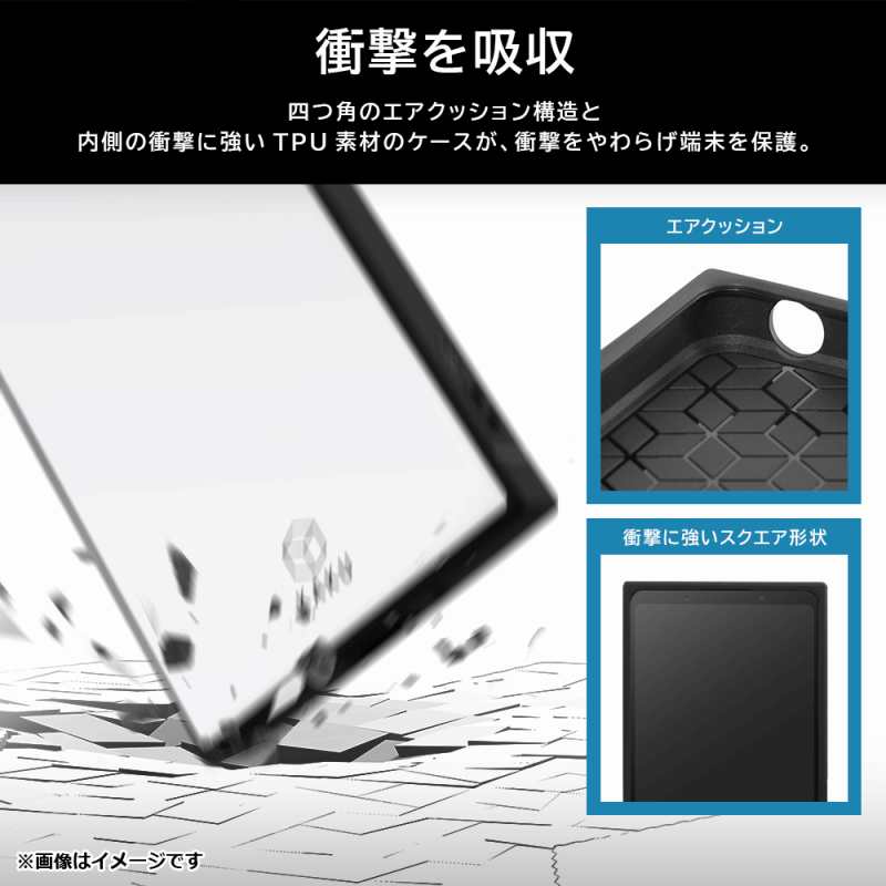 背面は傷に強いポリカーボネイト。側面は衝撃を和らげるTPU素材。四つ角エアクッション付。ストラップホール付。