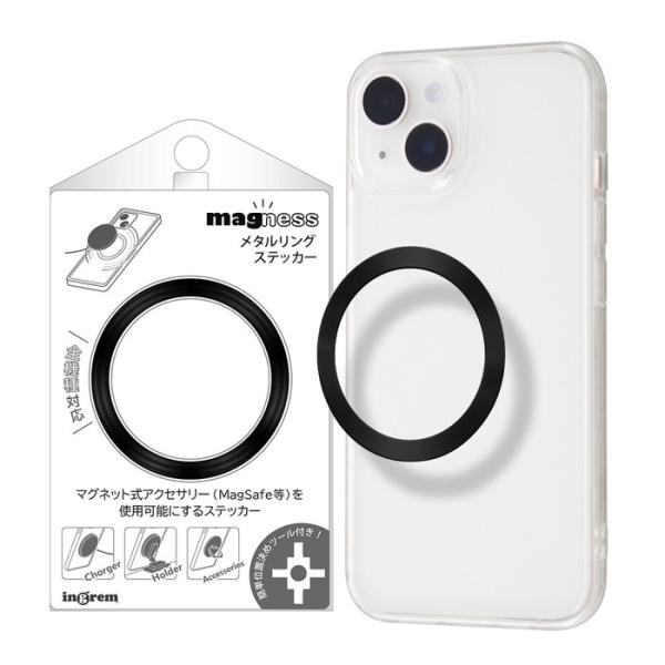 - ●気になる商品■ 貼り付けるだけでお使いのスマートフォンをマグネット式アクセサリー(MagSafe等)対応にするリングステッカー。■ 簡単位置決めツール付き。[仕様情報]素材 : アルミ、鉄■ 本製品を下記のようなケースに貼り付けた場合、MagSafe等のマグネット式充電器は使用できません。・ ケース背面部分の厚みが2mm以上・ 金属素材のケース・ 貼り付け面の形状及び素材によっては貼り付かないことや粘着しにくいことがあります。・ シリコン、レザー、布などの貼り付きにくい素材・ 特殊加工がされている、湾曲しているもの■ 本製品の位置決めツールは中心に貼り付ける為のもので、上下左右対称なケースにのみ対応しています。ワイヤレス充電が端末中心で反応する端末にのみ対応しています。■ ワイヤレス充電機能の無い端末ではワイヤレス充電は使用できません。■ ご使用のケースによっては中心に貼ることが出来ない場合があります。中心からズレて貼り付けた場合、充電が出来なかったり本製品や端末が熱くなる場合があります。■ 本製品の使用によるスマートフォン、カード等の紛失や破損(内部データ含む)、事故や怪我及び誤った使用方法により発生する問題には一切保証いたしかねます。■ 本製品を高温になる場所に放置しないでください。変形や変質の原因になります。■ 本製品に対応するアクセサリーを装着する際、指を挟んで怪我をしないようご注意ください。■ 本製品を取り付けてMagSafe等のマグネット式充電器を使用すると充電速度が低下する場合があります。■ 本製品に対応するアクセサリー等を付けた状態でアクセサリーだけを持たないで下さい。落下や破損などの原因になります。■ 本製品を無理に剥がすと、製品の破損や端末、ケースの塗装等が一緒に剥がれる可能性があります。■ ご使用環境や素材によっては本製品を剥がした際に粘着跡が付く場合があります。■ 貼り付け直後は、粘着力が弱いため取り扱いにはご注意ください。24時間経過してからご使用ください。■ 小さいお子様の手の届かないところに保管してください。[メーカー]イングレム ingrem型番JANブラックIN-MGS1/B4570128259964ゴールドIN-MGS1/GD4570128259971シルバーIN-MGS1/SV4570128259988ブルーIN-MGS1/A4570128259995レッドIN-MGS1/R4570128264012ピンクIN-MGS1/P4570128264029ラベンダーIN-MGS1/LD4570128264036オリーブIN-MGS1/OV4570128264043[対応] スマートフォン[性能] MagSafe規格で吸着[材質] アルミニウム[材質] メタル[色] オリーブ[色] ゴールド[色] シルバー[色] パープル[色] ピンク[色] ブラック[色] ブルー[色] ラベンダー[色] レッドingrem magness メタルリング ステッカー イングレム