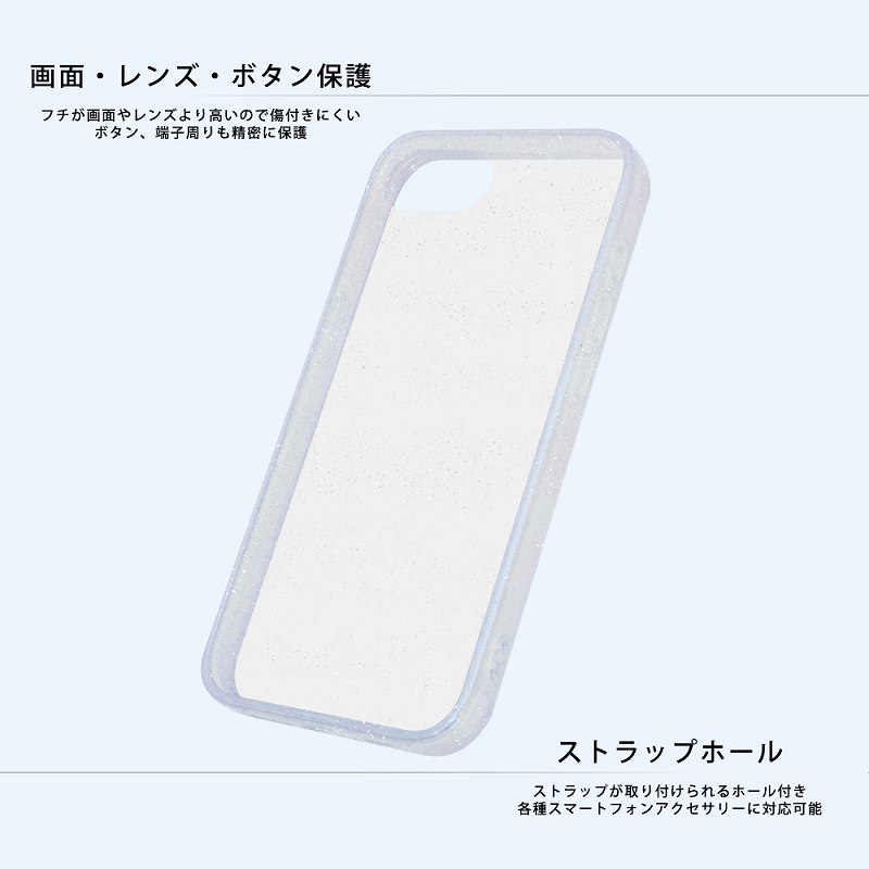 フチが高く画面やカメラが傷つきにくい。上品に輝く細かなラメ。ボタンや端子周りまで精密に保護。衝撃をやわらげるエアクッション構造。