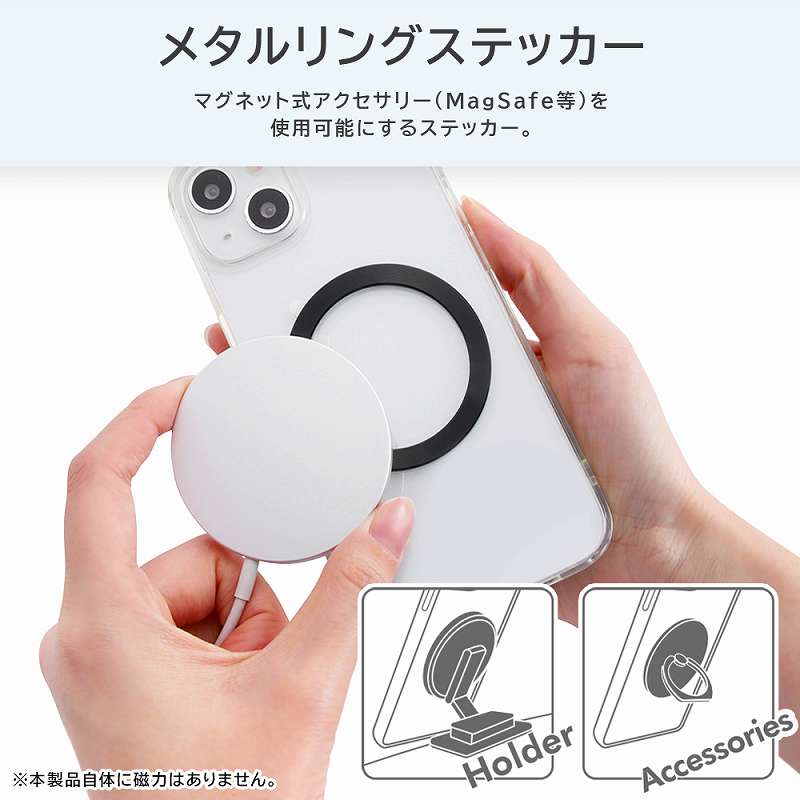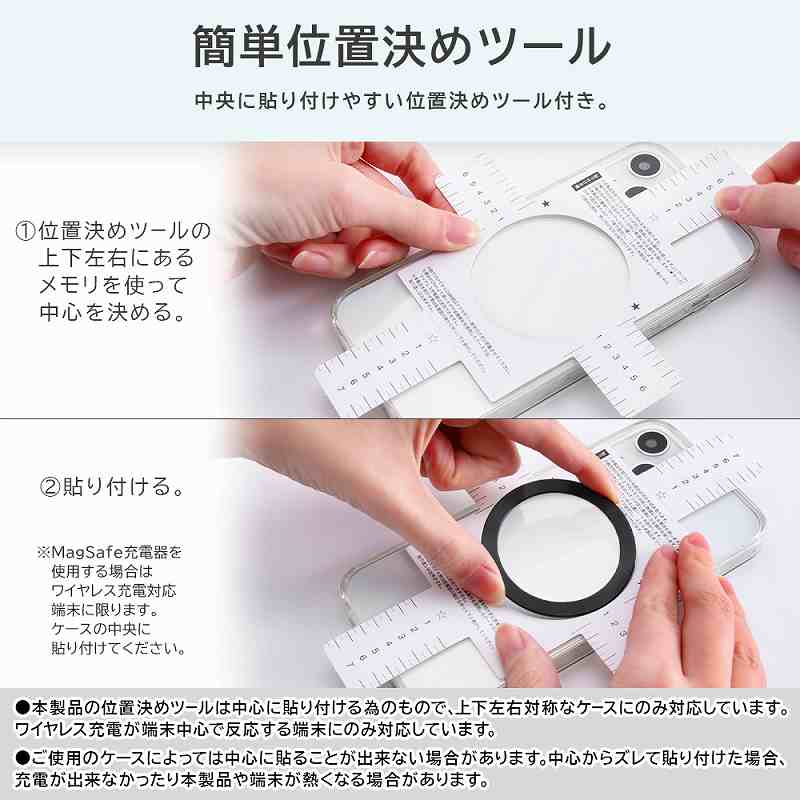 貼り付けるだけでお使いのスマートフォンをマグネット式アクセサリー(MagSafe等)対応にするリングステッカー。簡単位置決めツール付き。