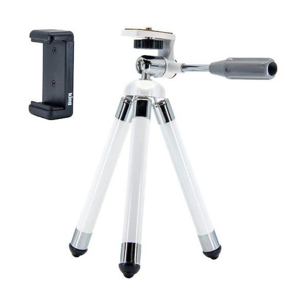 - King 「トリップエイト三脚」は携帯に便利な小型8段三脚です。スマートフォンホルダーが付属しており、お手持ちのスマートフォンで三脚を使用した撮影ができます。三脚・雲台は金属部品を使用している為、安定性・耐久性に優れます。脚部先端の石突き部分は滑りにくいゴム素材となっており、安定した設置が可能です。 【製品仕様】 伸長:63cm 縮長:20cm 質量:330g 段数:8段 最大脚径:15mm スマートフォンホルダー対応サイズ:56〜85mm 三脚材質:銅、亜鉛合金、鉄、アルミニウム、ABS、ゴム スマートフォンホルダー材質:ABS