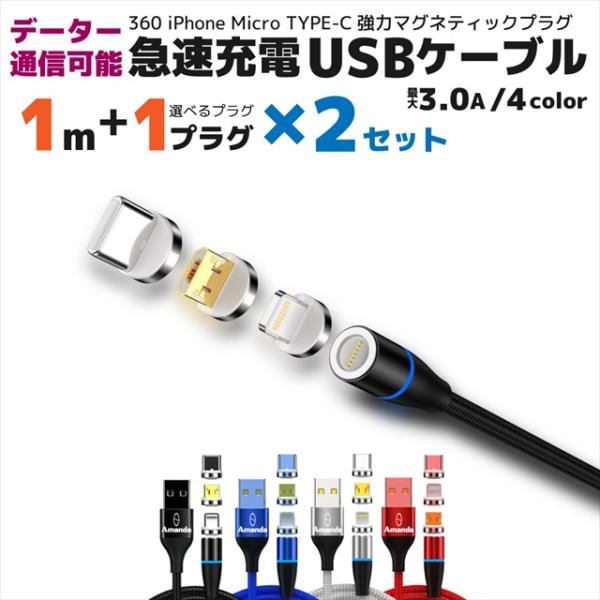 充電ケーブル iphone マグネット 式 マグネット 式 1m 2本セットmicro type-c 充電 高速 データ転送 3a 急速充電 15w 360 4カラー ライトニング