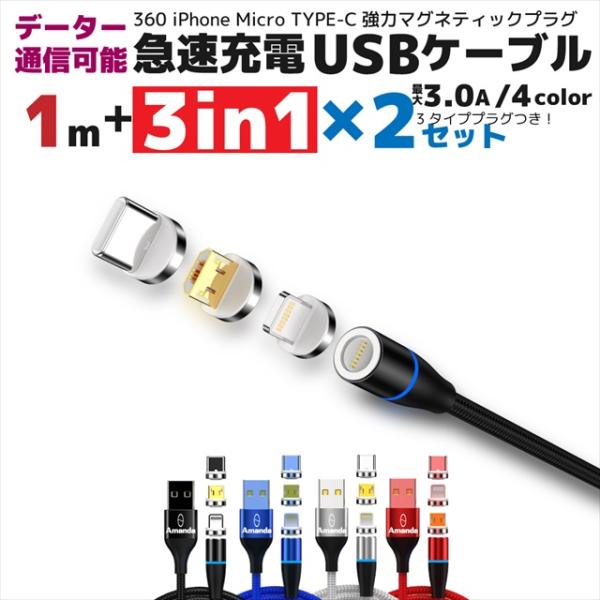 充電ケーブル iphone マグネット 式 マグネット 式 3in1 1m 2本セットmicro type-c 充電 高速 データ転送 3a 急速 15w 360 ライトニング