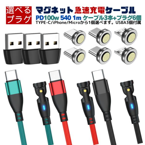 充電ケーブル iphone マグネット 式 1m ケーブル 3本 プラグ 6個 セットPD 100W 3a 急速充電 540 6IN1 100w 27w 18w type-c USB-C タイプc micro ライトニング