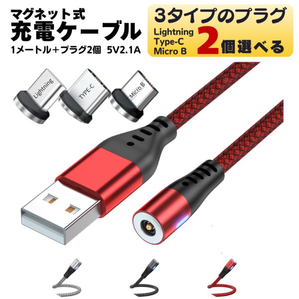 充電ケーブル iphone マグネット 式 プラグ いずれか 2個 ケーブル 1m 急速 2.1A 高速 急速充電 360cly type-c タイプC ライトニング