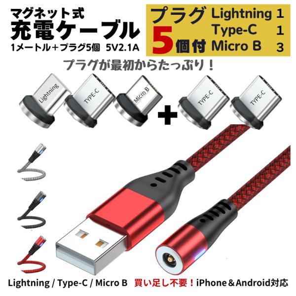 充電ケーブル iphone マグネット 式 選べる プラグ 1個 ケーブル 1m 急速 2.1A 高速 急速充電 360cly type-c micro タイプC ライトニング