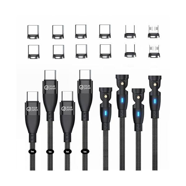- JJ JULIE JAPAN マグネット充電ケーブル PD対応 9PIN 100W 1m4本 マグネット端子3種類セット(USB-C、Micro-USB、アイプロダクト) 【PD100W充電対応 マグネット充電ケーブル】このマグネットUSBケーブルはUSB PD(USB Power Delivery)とQC(Quick Charge)の両規格に対応しています。USB-Cコネクタ〜USB-Cコネクタで接続した場合、PD100Wの超高速充電が可能です。TYPE-C端子〜アイプロダクト端子で接続した場合、PD27Wで充電することが出来ます。また、電源側に使用できるUSB-A変換アダプタが付属されています。、お手持ちの充電器の電源ポートに合わせてご使用いただけます。 【USB-Cによる充電対応端末】JJ JULIE JAPANのUSB-Cマグネットケーブルは、電子デバイス側の充電端子がUSB Type-Cポートに適合します。ノートパソコンはもちろん、Type-Cコネクタ搭載のタブレット、スマホ、ゲームコントローラーなどに繋いで急速充電が可能です。また、480Mbpsのデータ転送に対応しており、音楽、映画、写真、HD動画を急速に転送できます。 【USB-Cターミナル部分を保護】 従来のUSB充電ケーブルと比べ、このマグネットUSBケーブルは、充電ケーブルの先端にマグネットを採用しています。充電ケーブルの抜き差しを低減することによって、お使いのデバイスのUSBタイプCポートの消耗を減らします。マグネット端子を挿したままにすることで防塵機能を発揮します。充電中に充電ケーブルを引っ張り、本体を落下させることによる充電デバイスの破損を防ぐことができます。また、車の中などスマホスタンドにスマホを置いているでも、マグネット充電ケーブルを片手で接続し充電することができます。 【540度回転とワンタッチ接続】このマグネット充電ケーブルは、充電ケーブルの先端を180度スイングできるため、充電ケーブルの先端をL字型にして使用できます。マグネット端子部分が円形デザインとなっており360度回転することで、マグネット充電ケーブルのねじれを防止します。ワイヤレス充電のような感覚で片手でストレスフリーに使用できます。また、暗闇でも見つけやすいふんわり明るいブルーLEDランプをマグネット充電ケーブルに搭載しています。ブルーLEDの点灯方式は、USBケーブルを接続し充電中には常時点灯します。非通電時は消灯します。 【優れた耐久性充電コード】充電ケーブルには強化ナイロン素材を採用し耐久性に優れています。特別なストレステストを実施し、30,000+回以上の曲げテストに耐えます。内部は高純度線芯を使用しており、良好な熱放散能力を備えます。急速充電ケーブルなので、急速充電すると、スマホと同様に30〜40度のほんのりと熱くなります。過充電保護機能があり、電力が約80%に達すると充電速度が低下し、当然熱も低下します。電極部分にゴミや砂鉄が付着したまま使用すると発熱し大変危険ですので、使用前に端子部分にゴミが付着していないか確認してください 商品コード65077193767商品名JJ JULIE JAPAN マグネット充電ケーブル PD対応 9PIN 100W 1m4本 マグネット端子3種類セット(USB-C、Micro-USB、アイプロダクト)型番9PIN100WALL1mBK4サイズ1m4本_端子12個カラーブラック※他モールでも併売しているため、タイミングによって在庫切れの可能性がございます。その際は、別途ご連絡させていただきます。※他モールでも併売しているため、タイミングによって在庫切れの可能性がございます。その際は、別途ご連絡させていただきます。