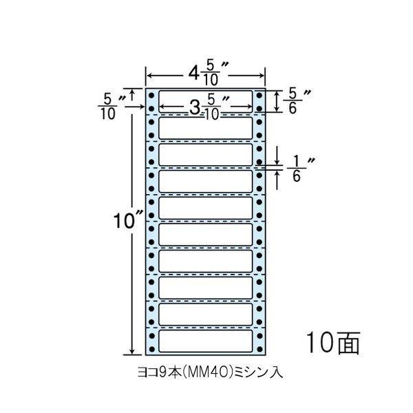 - 1折サイズ 4・5/10"×10" (114mm×254mm) ラベルサイズ 3・5/10"×5/6" (89mm×21mm) スペース ラベル左側 =5/10" ラベル間・天地=1/6" 面付 10面付 入数 1ケース 1,000折入り(500折×2) ×5 計 5,000折入り プリンタ ドットインパクトプリンタ用 剥離紙の色 ブルー 同型ラベル MM4T(白セパ) 特徴 横9本、ミシン目入り(MM4O型、ミシン目入り)