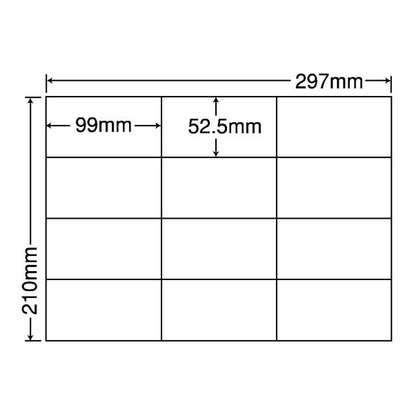 - 【仕様】●仕様:12面●シートサイズ:A4(210mm×297mm)●ラベルサイズ(横×縦):99×52.5mm●対応プリンタ:インクジェット(染料のみ)、モノクロレーザー、モノクロコピー、熱転写※顔料系インク、カラーコピー機には対応しておりません。●注文単位:1箱(100枚×5冊)●GPNエコ商品ねっと掲載