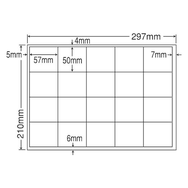 - 【仕様】●仕様:20面●シートサイズ:A4(210mm×297mm)●ラベルサイズ(横×縦):57×50mm●対応プリンタ:インクジェット(染料のみ)、モノクロレーザー、モノクロコピー、熱転写※顔料系インク、カラーコピー機には対応しておりません。●注文単位:1箱(100枚×5冊)●GPNエコ商品ねっと掲載