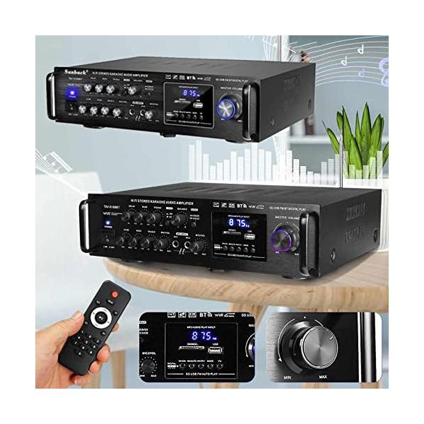 - 【Bluetoothオーディオサウンドアンプ・交換性抜群】:このHiFiパワーホームアンプはBluetooth対応できるワイヤレス車載用、家庭用ステレオレシーバーです。ブルートゥース機能を備えるので、スマートフォン、タブレット、ラップトップ、iPhone、iPadなどブルートゥースデバイスに簡単に接続できて、とっても便利なアイテムです。また、USBインタフェースを搭載し、プラグアンドプレイで、高品質の音楽を自由に楽しむことができます。 【家庭用と車載用に最適】このマシンのメインボリューム、トゥイーター、およびベースはすべてアナログコンポーネントによって規制されており、音楽の性質をより忠実に復元し、実際の音楽を聴いて、本当のHIFIサウンドエフェクトを提供できます。HIーFIサウンドエフェクトは音楽のジャンルやお好みより調節でき、ボタンによりボリュームを調節だけではなく、高音と低音も調節できます。低いディストレーション、音楽本来の音を再生します。家庭用と車載用に最適です。 【リモコン付き・デュアルマイク入力】全機能の赤外線リモートコントロール、便利なマンマシンの対話により、その機能を簡単に操作できます。