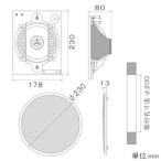 - 【仕様】●メーカー:オースミ電機 ●型番:OE-230MT ●商品名:天井埋込スピーカシステム ●天井埋込スプリングキャッチ式 ●ハイ・インピーダンス ●スピーカ:160mmコアキシャル2Wayスピーカ ●定格入力(W):3 ●公称インピーダンス(kΩ):3.3(3W)、5(2W)、10(1W) ●出力音圧(dB):91(1W/1m) ●再生周波数帯域:80Hz〜20kHz ●適合電線: ・単線(mm):φ0.8〜1.6 ・より線(㎟):0.75〜2(半田上げ推奨) ●使用温度範囲(℃):-10〜+50 ●色:アイボリー(W)(マンセル9.9Y8.7/0.75近似) ●サイズ(mm): ・本体:W230×H178×D80 ・グリル:φ230×D13 ●質量(g): ・本体:850 ・グリル:150 ●材質: ・本体:ABS樹脂 ・グリル枠:ABS樹脂 ・ネット:ラスメタルパンチング(メッキ+プライマー+塗装) 【用途】 ●ホテル、オフィスビル、共同住宅のBGM及び館内放送設備。 ●駅、空港、テーマパーク、学校、文化センターなど公共施設の放送設備。
