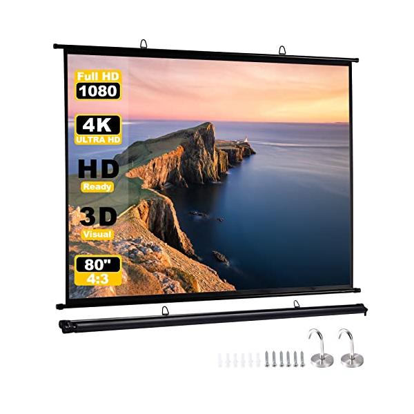 プロジェクター スクリーン 吊り下げ、スクリーン プロジェクター用、80インチ 4:3 ファイバーグラス、持ち運びや収納に便利なコンパクトサイズ