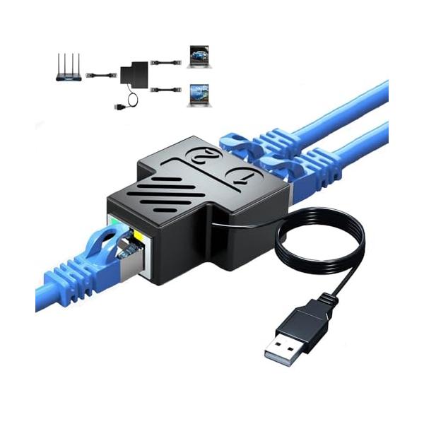 Wuedozue RJ45ネットワークスプリッターアダプター 1~2 デュアルメスUSBからRJ45ポート USB電源ケーブル付き LANインターフェ