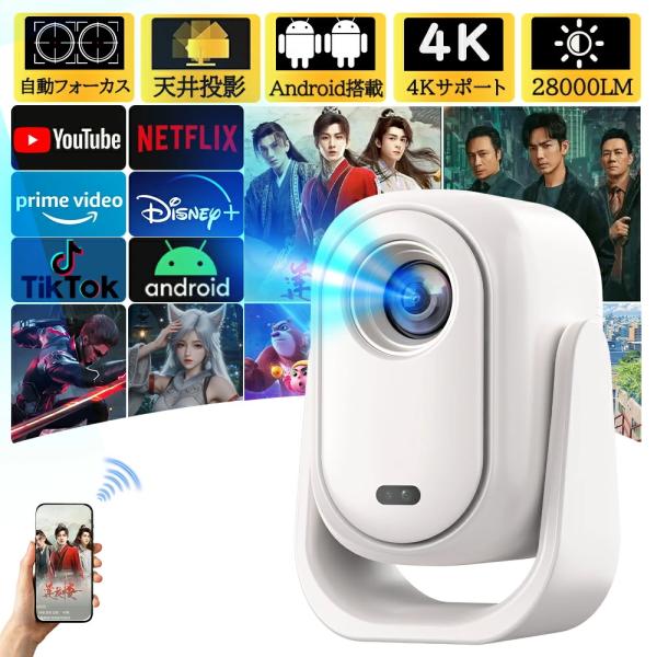 プロジェクター 小型 家庭用 天井投影 android搭載 スマホと繋げる 4K対応 自動フォーカス 自動台形補正 超高清 28000LM高輝度 スマホ 高画質 ホームシアター 壁