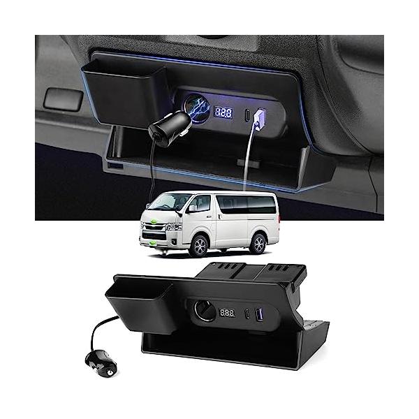 - 1.【適合車種】 トヨタ ハイエース 200系、年式:2004年~2020年。トヨタ レジアスエース 200系、年式2004年~現行。セット内容:増設電源ユニット×1PCS、ABS製、ブラック 。※グレード・オプション等により形状が異なる場合もございます。画像にて形状をご確認いただいたうえ、お買い求めください。◎本製品は弊 社「JIMUYA-TRADING」のオリジナル商品であり、必ず出品者/販 売元をご確認のうえお買い求めください。2.【製品仕様&急速充電】シガーソケット*1口、QC3.0搭載 USBポート*1口、Type-Cボート×1が搭載され、スマホだけではなく、タブレット端末や加熱 式タバコの充電、空気清浄機やドライブレコーダーへの給電など、合計10A/120Wまでの電装機器を使うことができます。※ご注意:Quick Charge対応機器に充電する場合、急速充電を行います。Apple iPhone・iPadなどのQuick Chargeに対応していないスマートフォン・タブレットに充電する場合は、機器を保護し、通常通り5V電圧を使用してUSB充電を行います。※3.【小物入れトレイ付き】周辺にちょっとした小物をいれて置けるトレイを追加しました。コインパーキング用の小銭、ポイントカード類、サングラスなどの収納スペースができ、車内の収納力を格段にUP!4.【LEDフットライト・電圧計付】おしゃれでクールな青い光で車内にワンランク上の高級感を演出し、夜間の車内で充電位置を一目で確認できるLEDフットライトが付いています。また、車両電圧計付きで、いつでも車両側の電圧を確認できます。