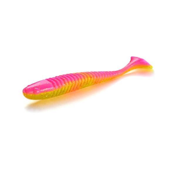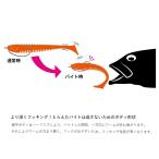 偏平ボディ&ハーフリブにより、バイトした瞬間、一方向にワームが折れ曲がります。