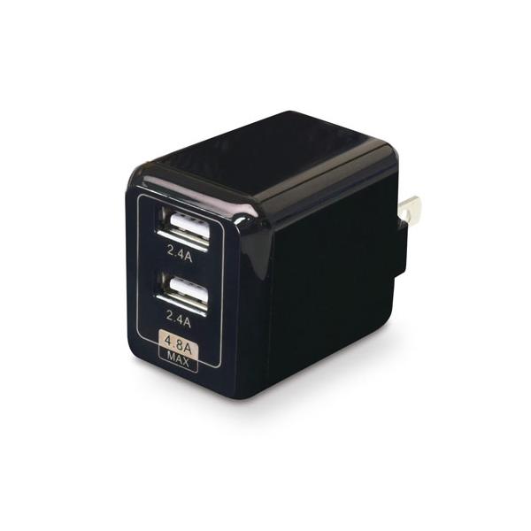 - タブレット×2台同時充電2.4Aの独立電流制限回路を搭載 安定したUSB出力を行うための2.4Aで電流制御を行います。 本製品は2ポート合計4.8A出力に対応したハイパワーUSB充電器で、それぞれのUSBポートが最大2.4Aまで安定した出力が可能な独立電流制限回路を搭載しております。タブレットやスマートフォンを同時に充電した際、1ポートだけに出力電流が集中しないように制御し、2台の機器を安定して充電することができます。 ハイパフォーマンス充電 接続機器の充電仕様に合わせて効率よく充電をおこないます。 本製品は独立電流制限回路でそれぞれのUSBポートを安定させ、接続した様々な機器を効率よく充電します。 タブレットを2台同時に充電 iPadなどタブレットを2台同時に充電することができます。 それぞれのUSBポートが最大2.4Aを安定して出力することができるので、iPadなどタブレット端末を同時に2台充電することもできる高性能USB充電器です。 iPhoneX/8を急速充電 それぞれのUSBポートが最大2.4A出力に対応しておりスピーディーに充電できます。 iPhoneに標準で付属するUSB充電器(1A出力)と比較して、2.4Aの安定した電流を供給することができるので、急速充電対応スマートフォンをより効率的に充電することができます。 ※急速充電対応ケーブルをご利用ください。 軽量・コンパクトUSB充電器 折畳式プラグでコンパクトに収納 本体に電源プラグを収納すると約35×45×51mmになるコンパクト設計で重さも約78gと軽量です。カバンの中に一つあると、カフェや外出先、旅先での充電に役立ちます。●入力:AC 100-240V 50/60Hz ●出力: DC 5V 2ポート合計 4.8A(max.) USB1= 5V / 2.4A(max.) USB2= 5V / 2.4A(max.) ●保護回路:過電流、ショート ●使用可能温度:0度〜30度 ●サイズ:約51mm × 45mm × 35mm(プラグ収納時) ●重量:約78g ●保証期間:購入日から6ヶ月間■送料 送料無料。但し、沖縄・離島を含む(一部配送不可地域)のご注文は配達不可のためキャンセルさせて頂きます。