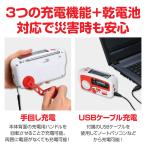 災害時にも頼れる多機能防災ラジオです。AM/FMラジオ・LEDライト・手回し充電・SOSサイレン・モバイルバッテリーの5機能を搭載。夜間や避難時も安心して使用できます。ソーラー・USB・手回しの3WAY充電に加え、乾電池も使用可能で、電源が確保できない状況でも安心です。軽量コンパクト設計で、防災バッグや車内の常備にもおすすめです。【商品スペック】光源:LED(発光ダイオード)、電源:リチウムイオン電池・単4アルカリ乾電池3本(別売)、充電池:3.7V/1200mAh(リチウムイオン電池)、充電方式:USB充電・ソーラー発電・手回し充電、電源入力:ソーラー発電0.2W・手回し発電1.5W、入力端子:USB Micro-B(DC5V)、出力端子:USB Type-A(DC5V-1A)、ラジオ受信周波数:AM 520〜1710kHz・FM 76〜108MHz(ワイドFM対応)、充電時間(目安):ソーラー充電…晴天で約30時間(季節、天候により変わる)・USB充電…約3時間、使用可能時間(目安):LEDライト使用時…約6〜8時間、ラジオ使用時…約4〜6時間