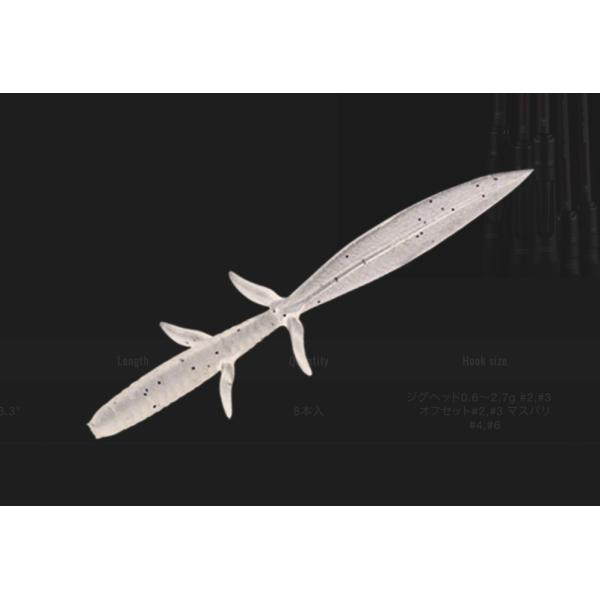 シラウオパターンの威力を知らしめた名作ソフトベイト”シザーコーム”の設けられたシザーアームの効果を徹底検証し、2対のシザーアームが発生させるナチュラルな微波動とバランスの最適化を実現。また、細身のボディと縦方向にセットされたリーチテールにより、ローリングと微波動をボディからテールの先端まで伝えて存在をアピールします。