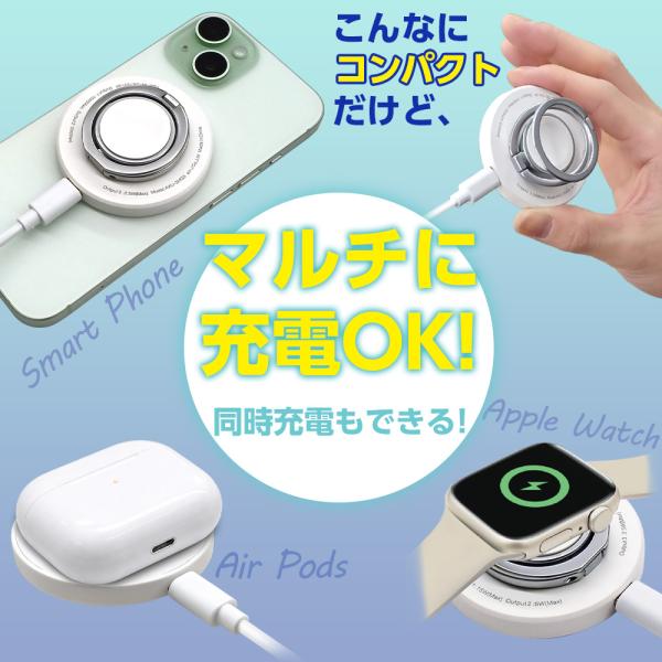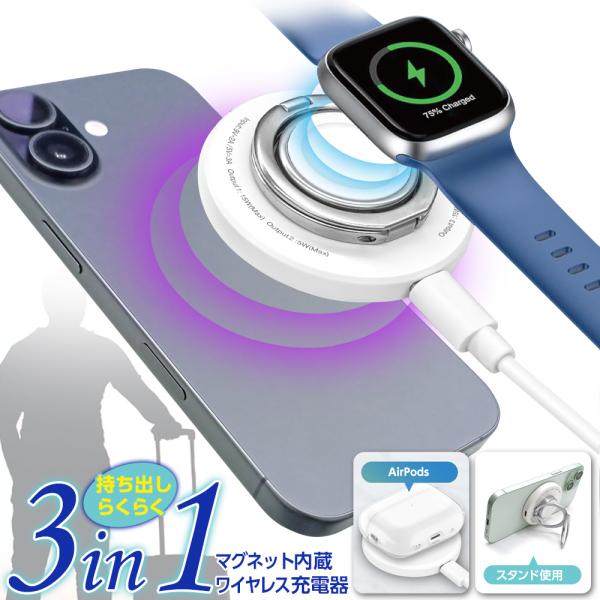 ワイヤレス充電器 MagSafe対応 マグネット内蔵 3in1 iPhone AppleWatch AirPods 背面装着 ワイヤレスチャージャー 同時充電可能 リング スタンド コンパクト