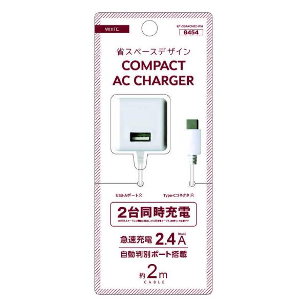 - 【商品解説】●最大出力2.4AのUSBポート付なので、機器を2台同時に充電できます●USBポートには接続機器を自動判別して最適な充電できる機能を搭載●離れた場所でも充電に便利なコード長さ約2m●コンパクトな設計&折りたたみプラグで持ち運びにも便利●100〜240V対応なので海外でもご使用になれます【スペック】●型式:ET-O24ACK02-WH(ETO24ACK02WH)●JANコード:4531916008454仕様1:■入力 AC100V〜240V 50/60Hz 0.3A■USB‐A出力 DC5V/2.4A(MAX)■Type‐C出力 DC5V/2.4A(MAX)■サイズ W35×H35×D35■重量 約74gこの商品は宅配便でお届けする商品です出荷可能日から最短日時でお届けします。※出荷完了次第メールをお送りします。配送サービス提供エリアを調べることができます「エリア検索」をクリックして、表示された画面にお届け先の郵便番号7桁を入力してください。ご購入可能エリア検索お買い上げ合計3,980円以上で送料無料となります。※3,980円未満の場合は、一律550円(税込)となります。●出荷可能日から最短日時でお届けします。(日時指定は出来ません。) ※お届け時に不在だった場合は、「ご不在連絡票」が投函されます。 「ご不在連絡票」に記載された宅配業者の連絡先へ、再配達のご依頼をお願いいたします。●お届けは玄関先までとなります。●宅配便でお届けする商品をご購入の場合、不用品リサイクル回収はお受けしておりません。●全て揃い次第の出荷となりますので、2種類以上、または2個以上でのご注文の場合、出荷が遅れる場合があります。詳細はこちら■商品のお届けについて商品の到着日については、出荷完了メール内のリンク(宅配業者お荷物お問い合わせサービス)にてご確認ください。詳しいお届け目安を確認する1度の注文で複数の配送先にお届けすることは出来ません。※注文時に「複数の送付先に送る」で2箇所以上への配送先を設定した場合、すべてキャンセルとさせていただきます。