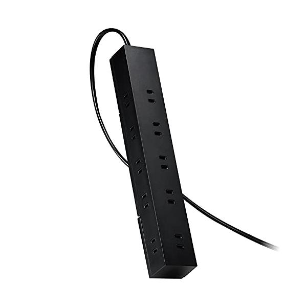 ・上面と側面にそれぞれ5個口ずつ、計10個口の2ピン式差込口を搭載した電源タップです。脚パーツを展開することで重いACアダプタなどを接続した際もタップが横転しにくくなります。また、直径10mmの吊り穴と直径5mmのネジ固定穴、底面にはL字型のダルマ穴を備えており、付属のタッピングネジで壁などに吊ったり、固定して利用できます。コードの長さは3mです。