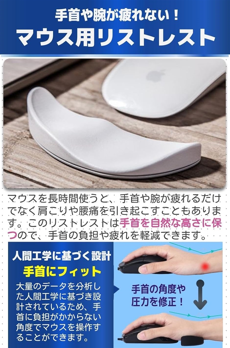 「商品特徴」 人間工学に基づく:誰の手にもフィットするデザイン マウス操作に追従:マウスに連動するから手首を固定しない 手首の負担軽減:手首を負担が少ない高さに保つ コンパクトなサイズ:持ち歩きにも便利な手のひらサイズ