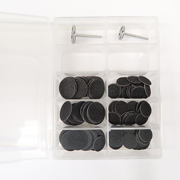 - ビット/ラージ・スモール各1本 ファイル/ラージ・スモール全6種類 計150枚 (F:ファイン M:ミディアム C:コース 各25枚) ディスクビットラージ・スモールの2種類と、それぞれのファイル コース・ミディアム・ファイン各25枚ずつがケースに入ったセットです。 品番:MB−DBS01