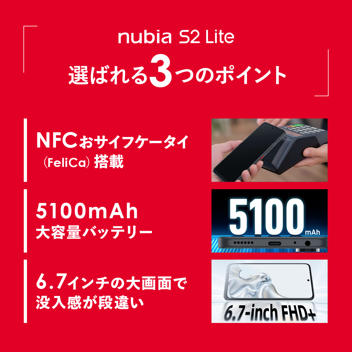 nubia(ヌビア) S2 Lite 日本版 SIMフリー スマートフォン ブラック 4GB+128GB 本体 5G 6.7インチ 5000万画素 50MPカメラ 5100mAh IP68/69防水防塵