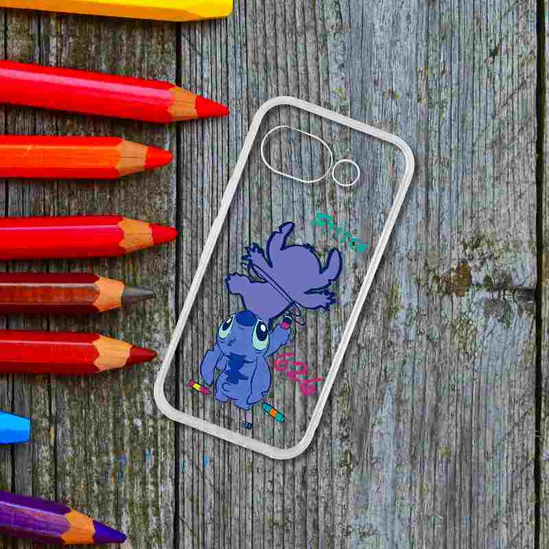 お絵描きが好きなスティッチが、自分自身を描いている、遊び心たっぷりのデザインが楽しめる透明感のあるハイブリッドケース。