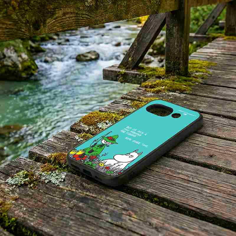 表面硬度2Hのムーミンとスナフキンが見つめ合い話合う姿が可愛いらしいデザインをあしらったハイブリッドケース。